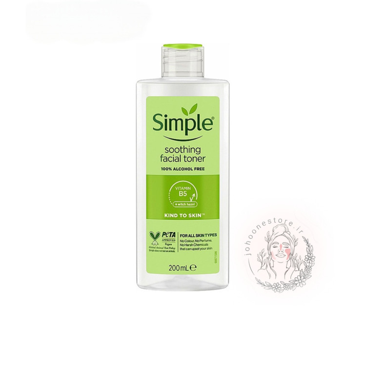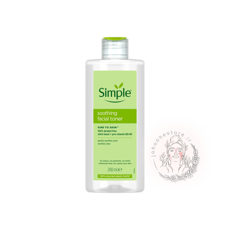 تونر Soothing سیمپل یک تونر آبرسان و تسکین دهنده بوده که دارای ترکیبات مغذی است. این تونر حاوی پرو ویتامین B5، ویچ هازل(فندق جادوگر)، بابونه، هامالیس و آلانتوئین است و علاوه بر پاکسازی عمیق پوست، آن را تغذیه و آبرسانی میکند. همچنین فاقد عطر، رنگ مصنوعی و مواد شیمیایی بوده و برای پوستهای حساس نیز مناسب است.